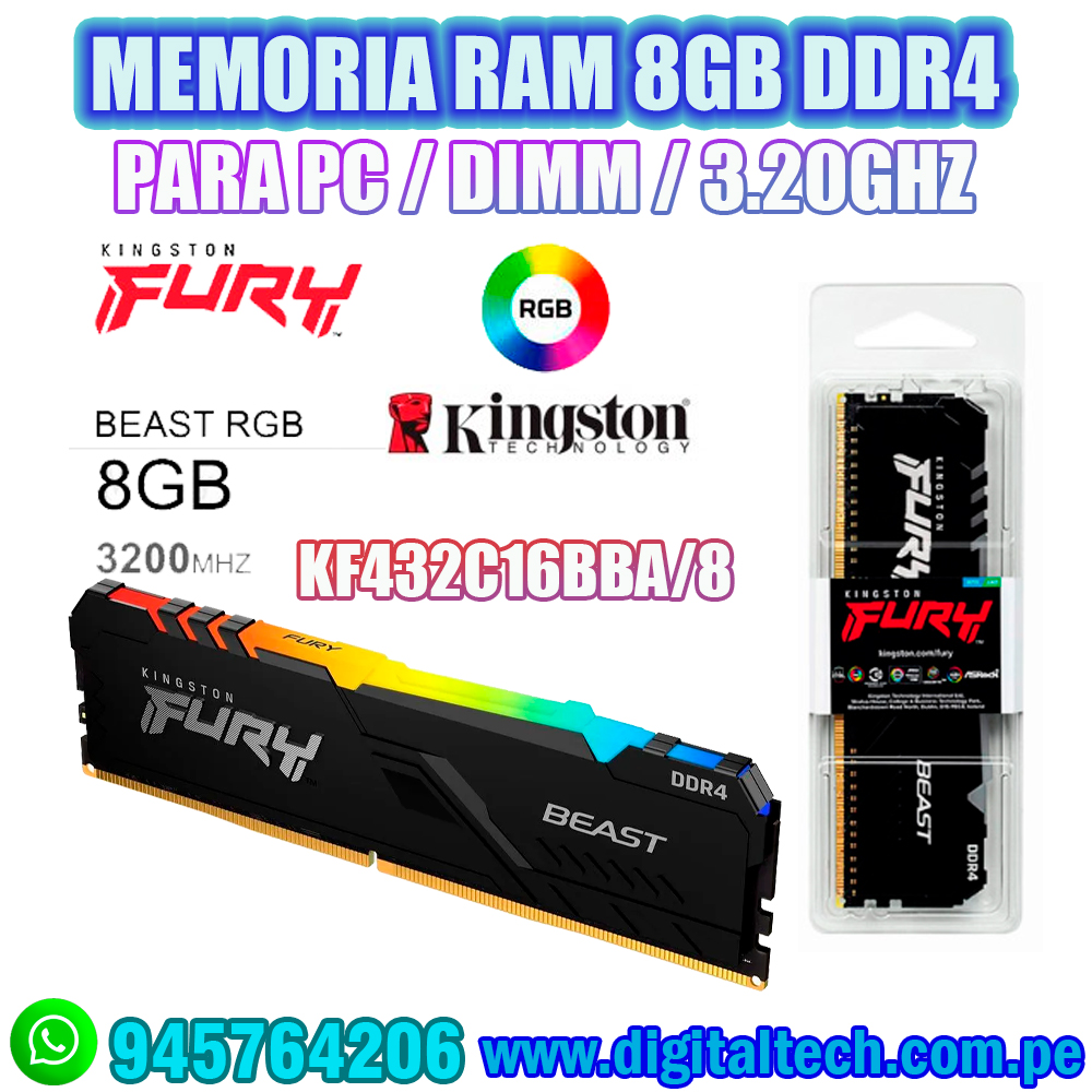 Memoria Ram DIMM Kingston FB 8GB DDR4-3200 MHz, PC4-25600, CL16, 1.35V, KF432C16BBA/8