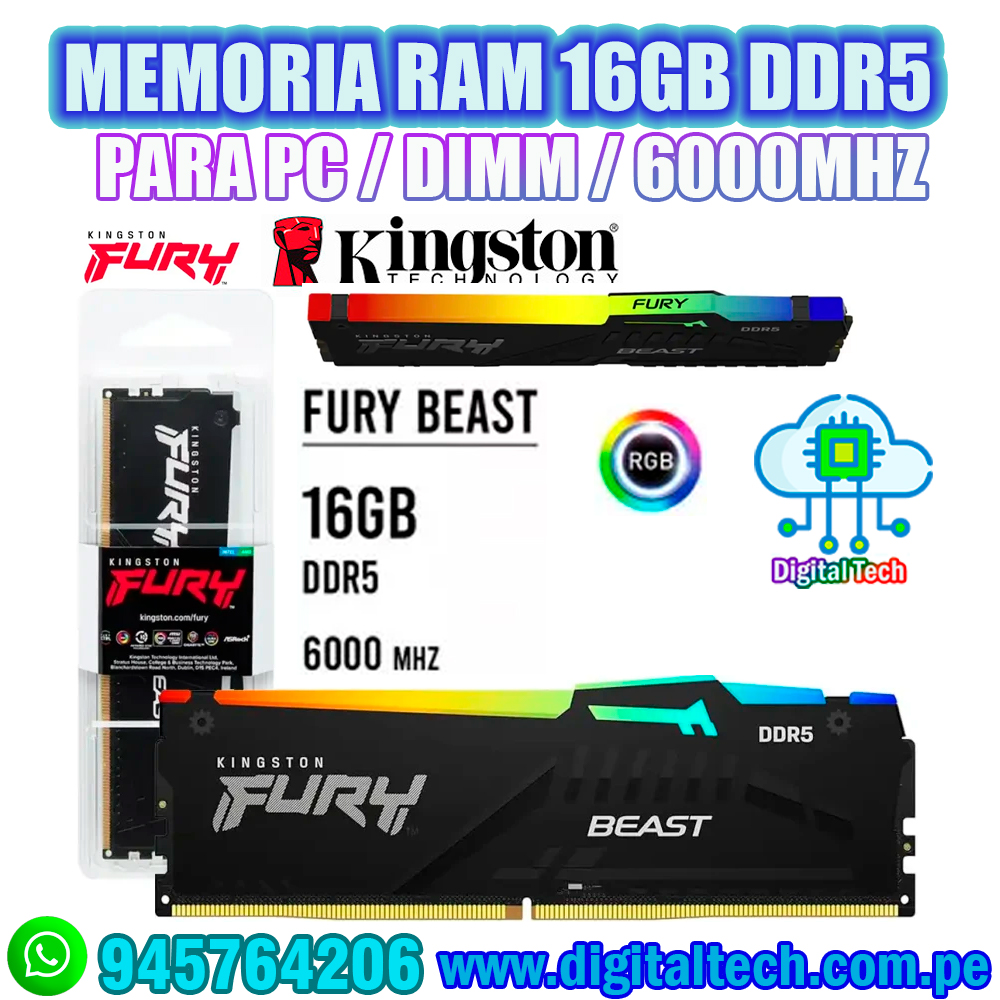 Memoria RAM DIMM Kingston Fury Beast 16GB DDR5-6000MT/s, PC5-48000, CL36, 1.35V, RGB. KF560C36BBE2A-16