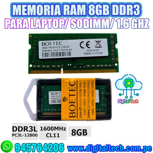 Memoria RAM SODIMM 8GB DDR3 1600Mhz, 12800S, BOETEC