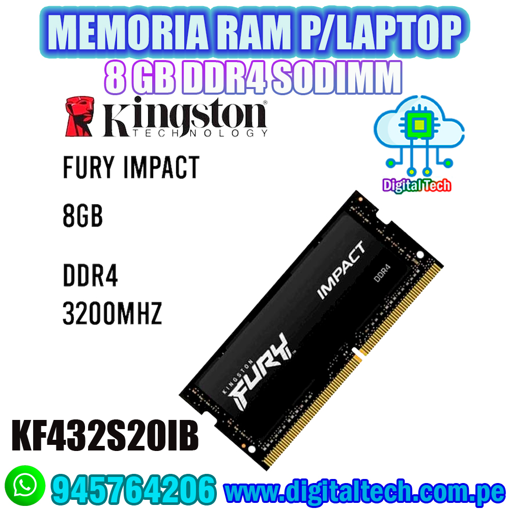 Memoria RAM SODIMM Kingston Fury Impact, 8GB, DDR4, 3200 MHz, PC4-25600, CL20, 1.2V. KF432S20IB/8